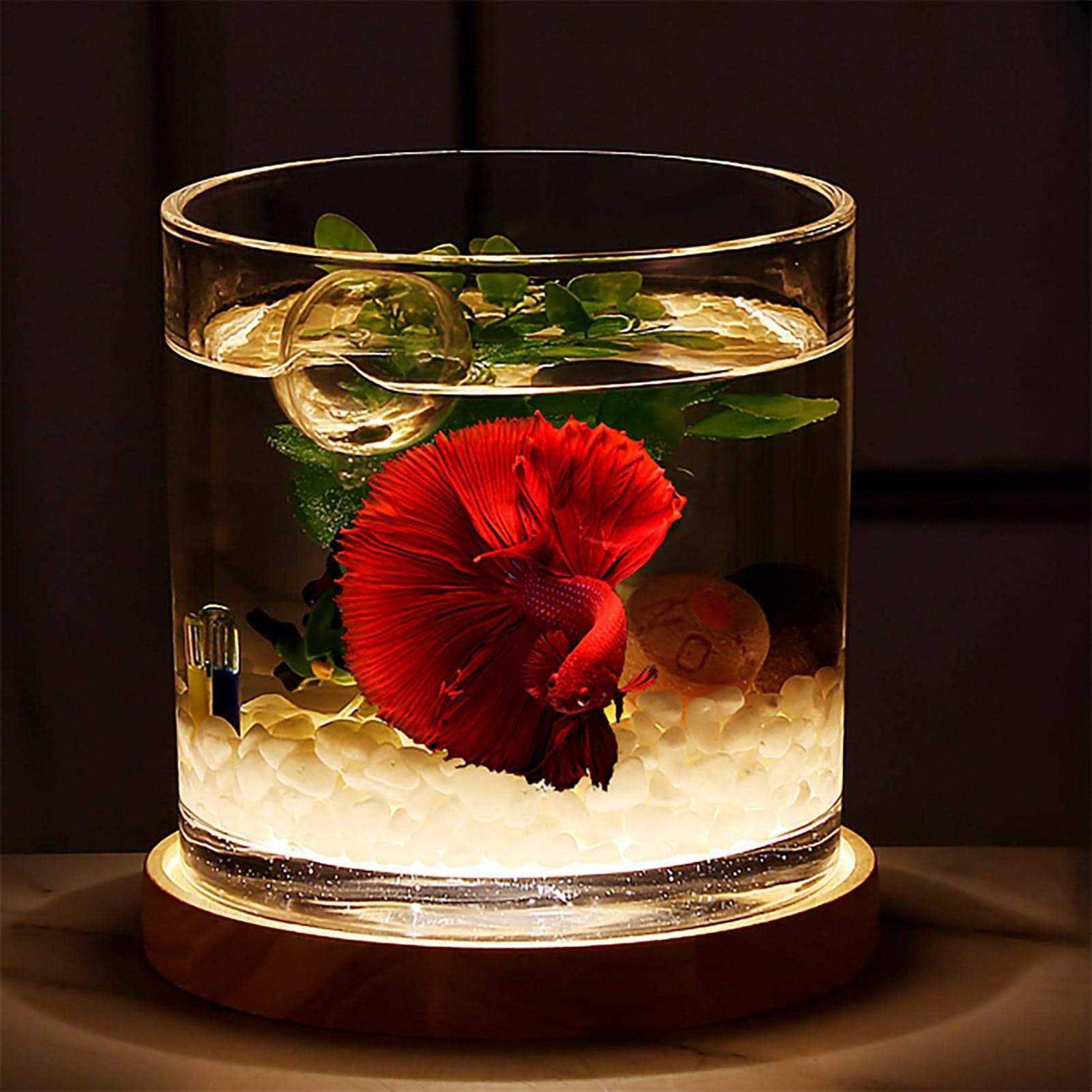 SANOSY Aquarium Starter Kits 0.81-Gallon Fish Tank for Beginner Cylindrical Betta Fish Bowl with Wooden Base LED Light Water Pump